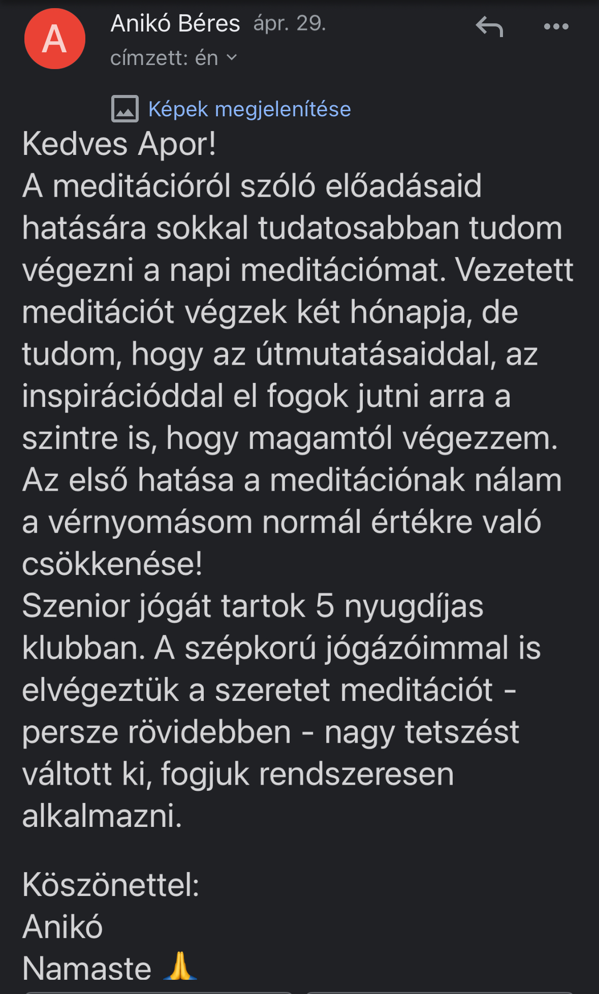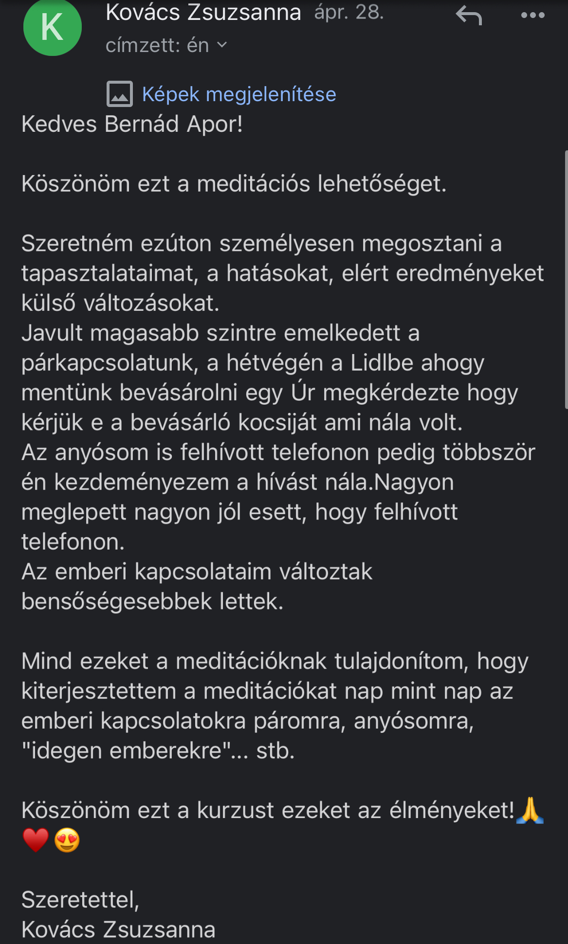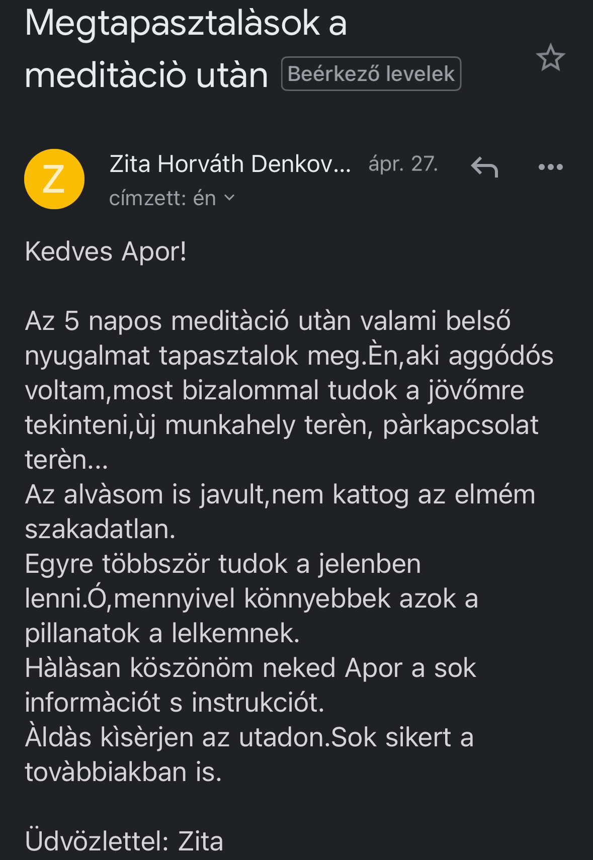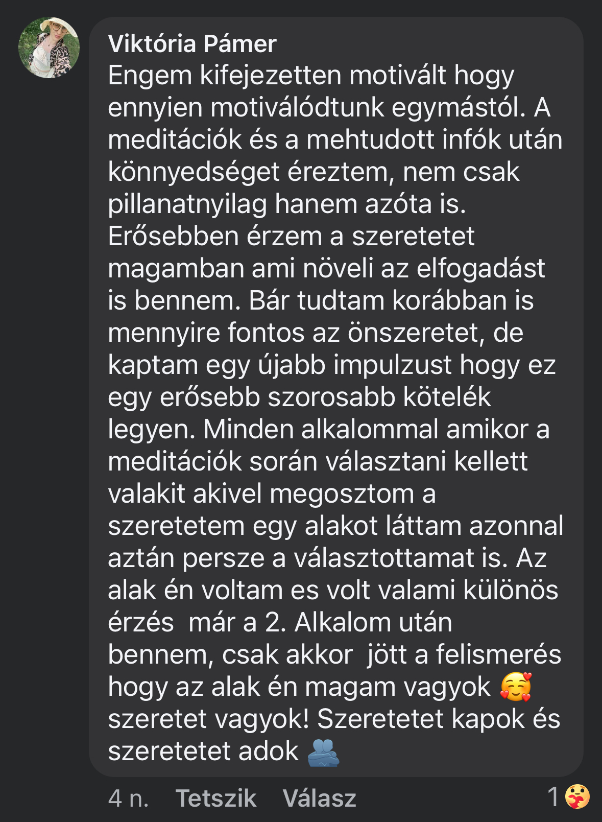 - Mert nincs meg az az élmény ami miatt motiváltak maradnának a gyakorlásra. Mi rendszeresen használunk olyan meditációkat amik a pozitív érzések fokozására alkalmasak.